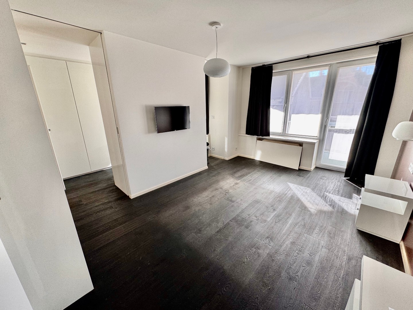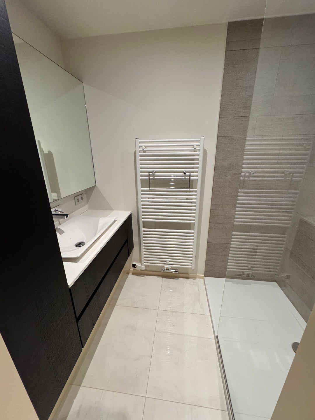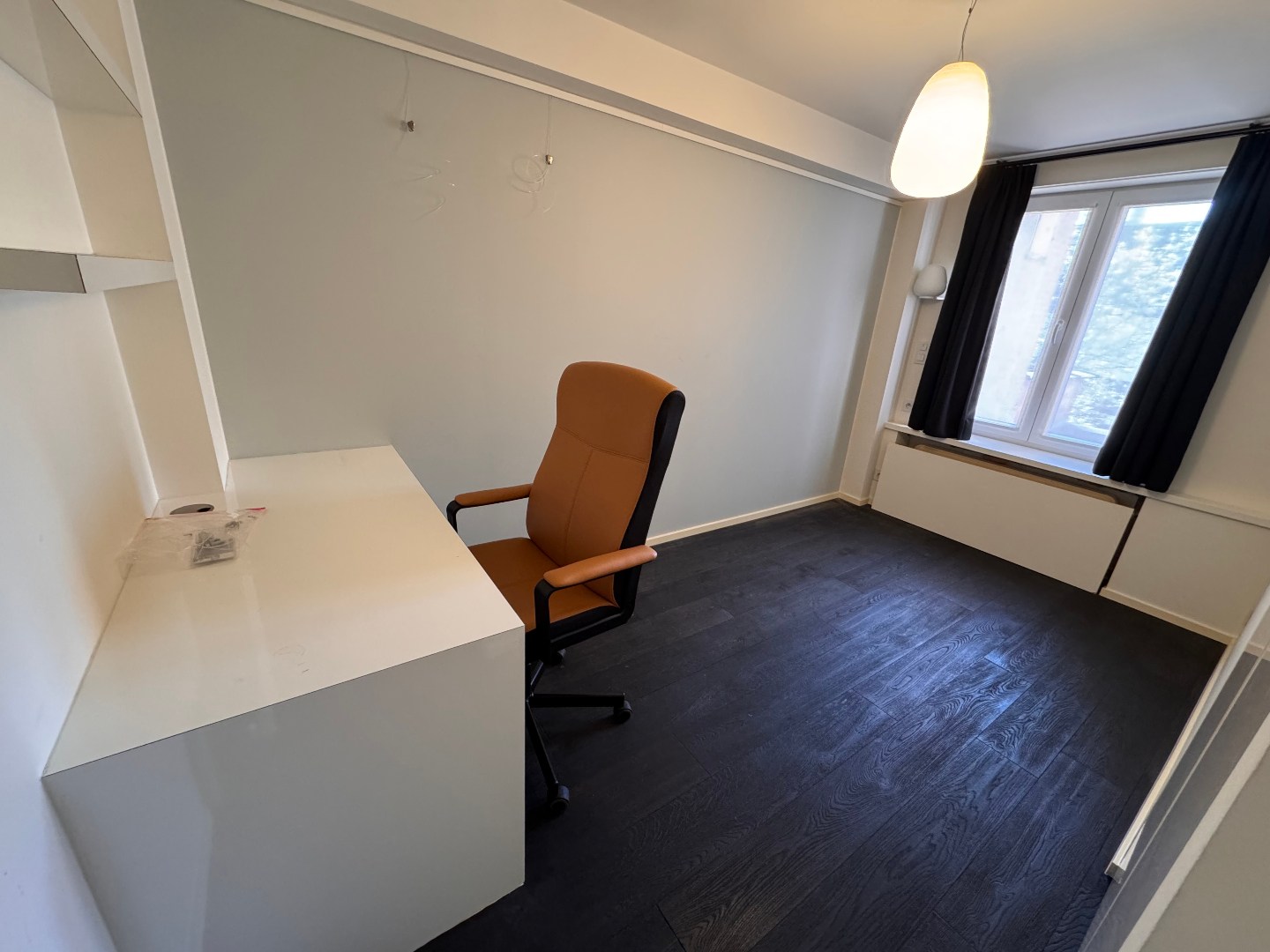 1 slaapkamer (parket) met ingemaakte kast en bureau + badkamer met inloopdouche en lavabo.